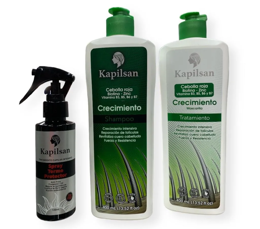 Kit de crecimiento capilar que contiene shampoo, tratamiento de cebolla y termoprotector.